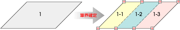 一筆の土地を数筆に分ける登記です。元の一筆の土地全体を測量して、筆界確定後、それぞれの面積を求積した地積測量図を添付して申請します。
